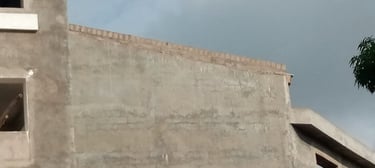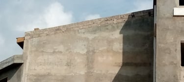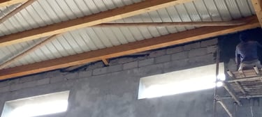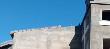 Sur les parties où le toit est complètement installé, on construit les acrotères en parpaings.