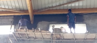On parallèlise autant que possible les différentes tâches. Pendant que certains travaillent sur les toits, les autres commencent l'application d'enduit de finition sur les poutres et les murs.