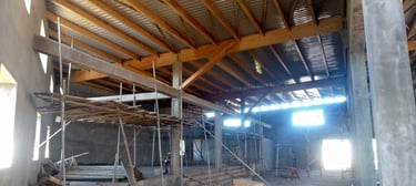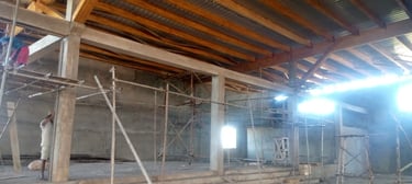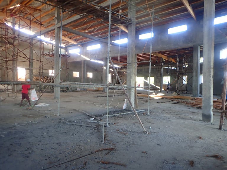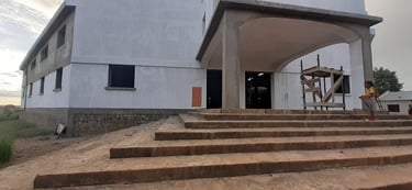 Au mois de février, l'abondance de pluie, habituelle en cette saison, limite les travaux qui peuvent être entrepris. Nous mettons à profit cette période pour ajuster les prévisions de planning pour les prochaines étapes, en fonction des possibilités financières et du calendrier : Nous mettons des bouchées doubles pour que le nouveau bâtiment puisse accueillir les quelques milliers de participants au rassemblement annuel du mois de mai.