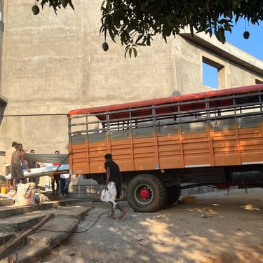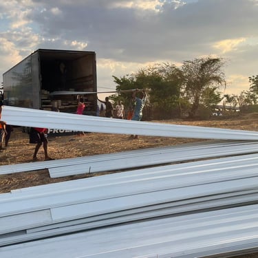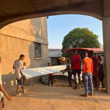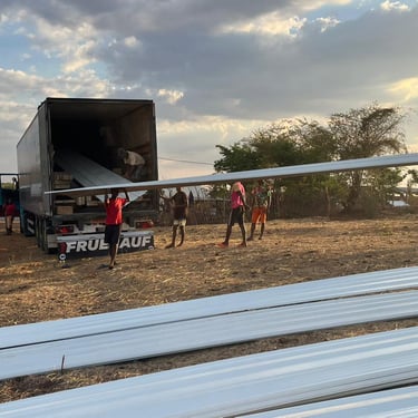 Après la trentaine de premiers kilomètres (aux environs d'Andranovelona), le semi-remorque transportant les premiers éléments de charpente et les tôles, est tombé en panne sans pouvoir repartir. Nous avons dû affréter un nouveau semi-remorque et procéder au transbordement de toute la cargaison.