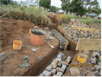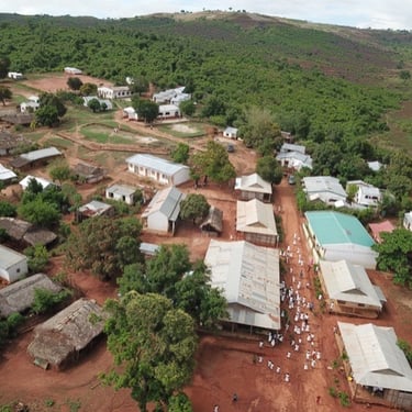 Pictures of the current church (rebuilt in 2008), an aerial view of the village, and the building foundation's first works
