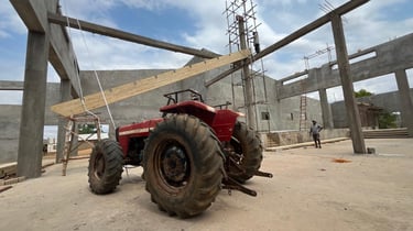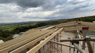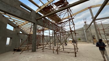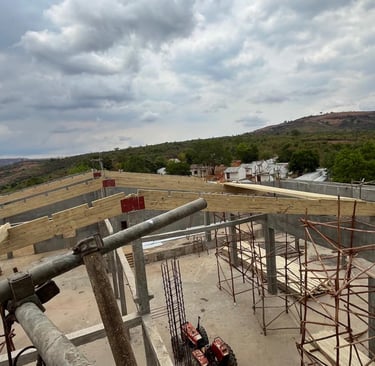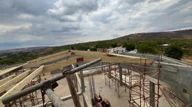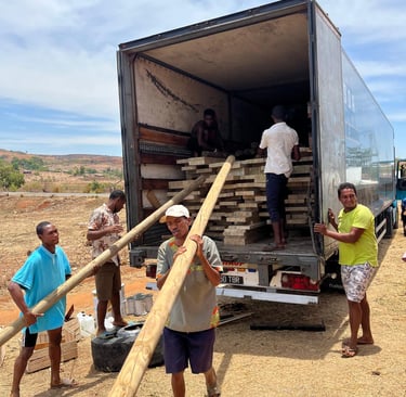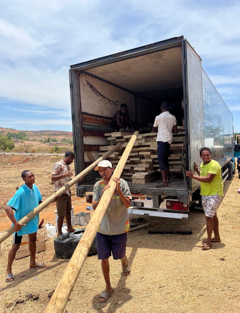 The assembly of the frame continues with the first shipment. The second cargo shipment is also eagerly awaited, along with the final one. In total, over 40 tons of materials were carried from Antananarivo via three truck trips, with a transfer required at the side of RN6 in Marovantaza for the last 5 kilometers on a secondary road.
