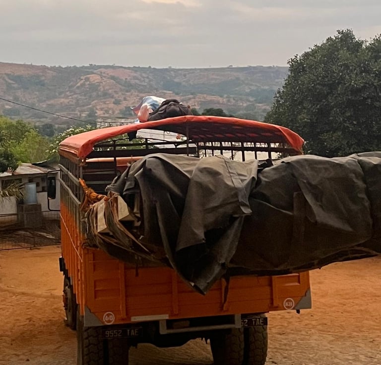 And so, here we go again with transshipment to another truck. It will take several back and forth trips along the 5 km of secondary road to carry it all.